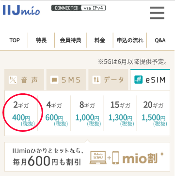 そして、iPhone の eSIM には、IIJmio(アイアイジェイミオ)のギガプラン から、eSIM 用の新料金プラン2GBを契約します。