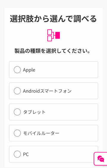 上記の特設ページで、手持ちのiPhoneが、楽天モバイルで使えるかどうかを調べるには、まずは、製品の種類の選択画面で Apple を選びます。