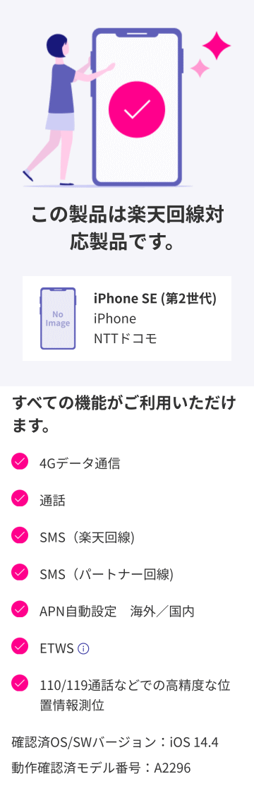 なお、NTTドコモ、au、ソフトバンクなど、キャリアから買ったiPhoneで、機種ごとに、楽天モバイルで使えるかどうかを確認したい場合は、以下の特設ページの方がスムーズです。